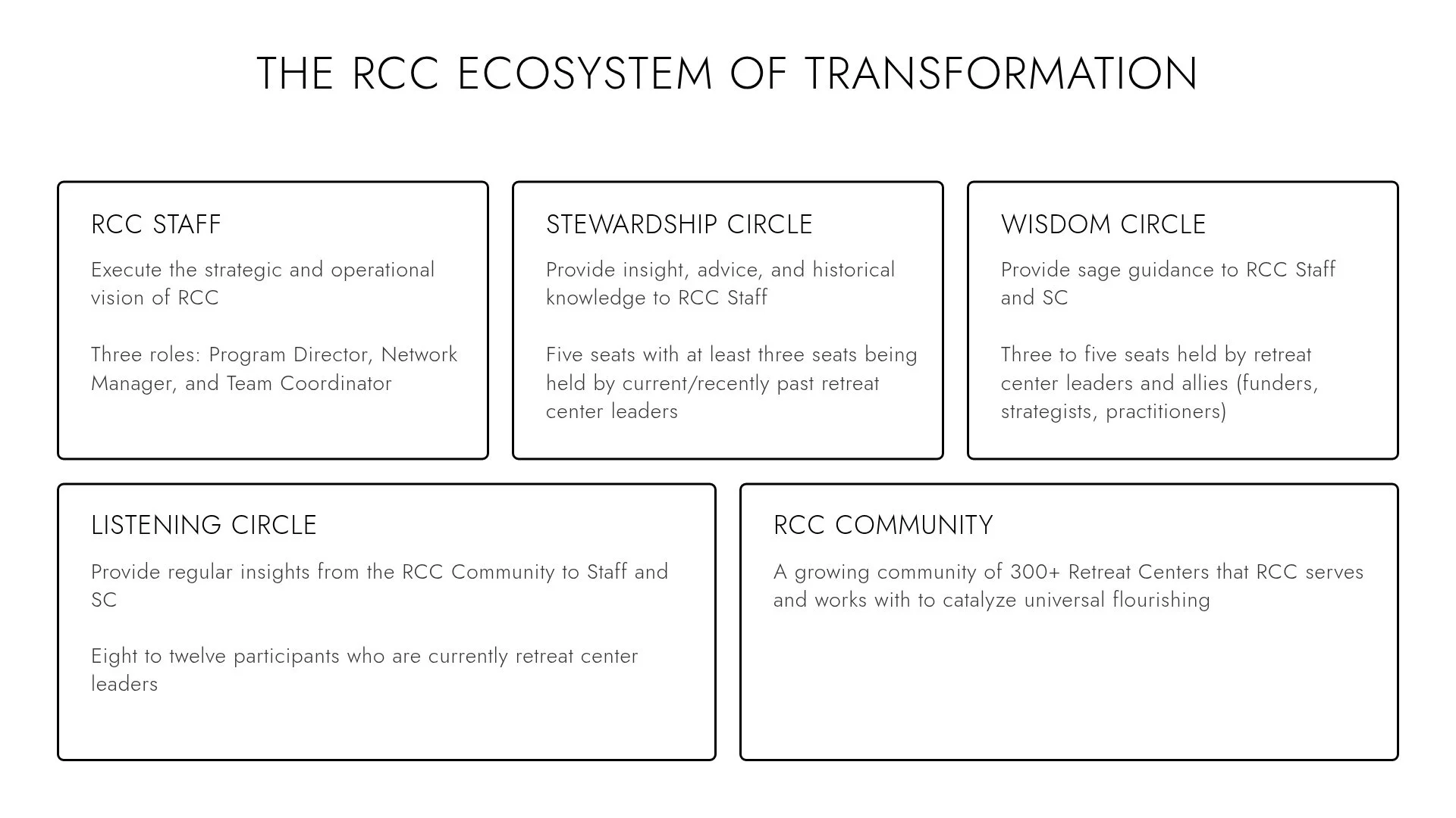 As the Retreat Center Collaboration (RCC) moves through 2025 with an eye to 2026, we are excited to share the ways our organizational structure continues to evolve—always with the intention of weaving connections, cultivating trust, and inspiring collaboration among retreat centers.